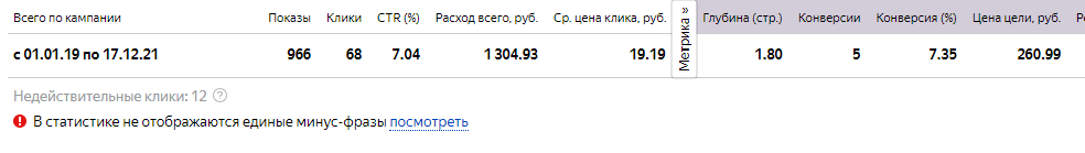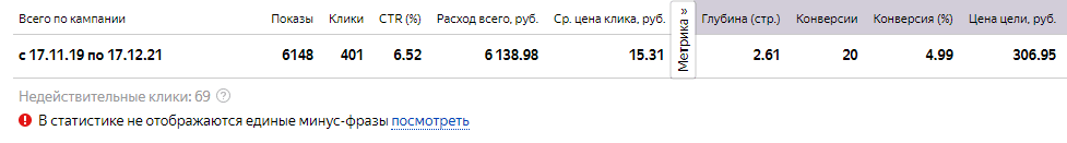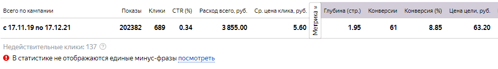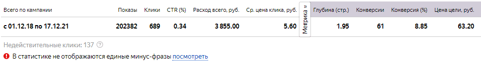 Отличные показатели, которые помогли основной рекламной компании. Очень дешевая стоимостью средней цены за клик. Хороший показатель конверсии