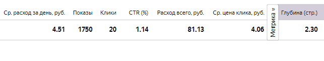 Это результаты за месяц. Хороший CTR и низкая цена клика, относительно конкурентов.