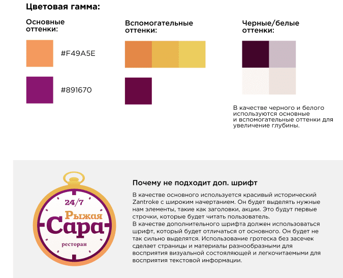 Цифры были опущены в пользу круглосуточной символики 24/7. Дескриптор — трактир, был упрощен, потому что является вторичным и не нуждается в дополнительном акценте. - Цвет. Исходя из нейминга хорошим решением будет использовать оранжевый в качестве основного. Этот яркий оттенок ассоциируется с весельем и беззаботным времяпровозждением.В качестве акцентного добавлен фиолетовый оттенок. Он ассоциируется с необычным и хорошо сочетается с основным оттенком. Яркие оттенки привлекают внимание и быстро бросаются в глаза.