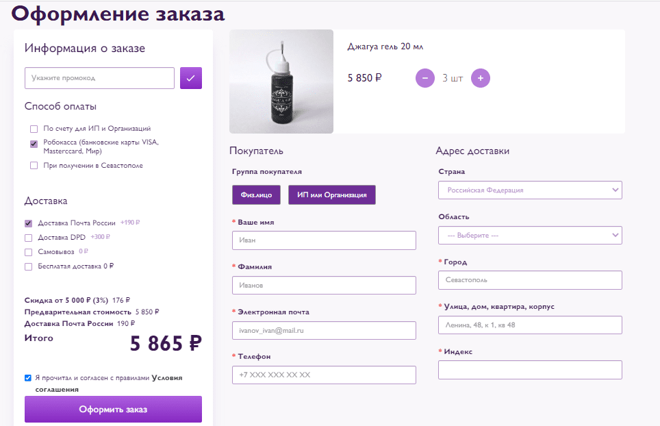 • Разделение оплаты для физ.лиц и юр.лиц. Для юр.лиц — отправка счета на почту, для физ.лиц — онлайн оплата по карте.