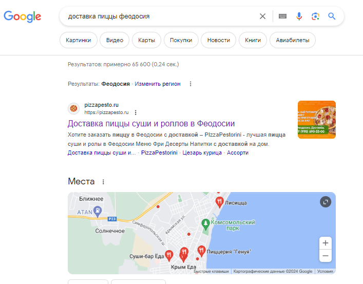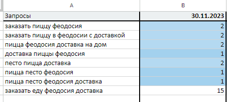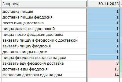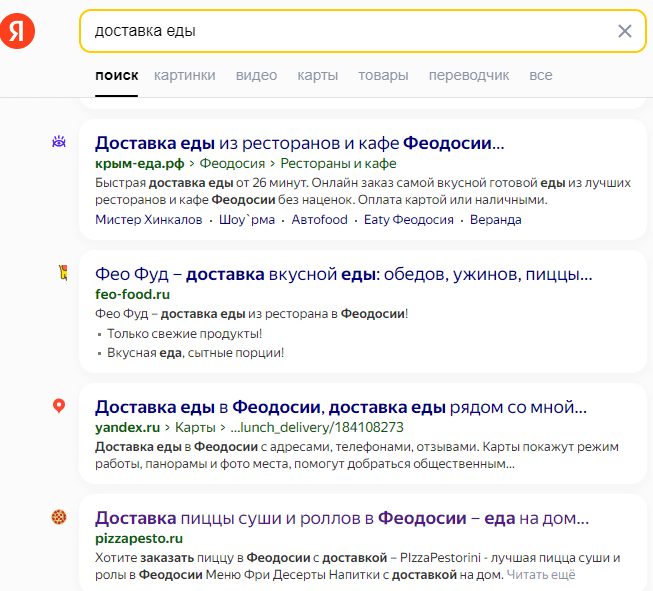 В нашем сопровождении 2 города: Феодосия и Саки. По Феодосии мы имеем очень крепкие позиции по большинству запросов, сейчас усиленно двигаем новое направлении: «суши»: