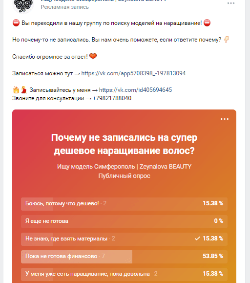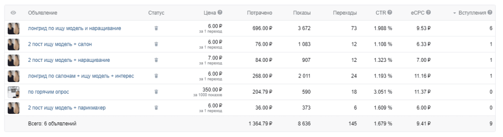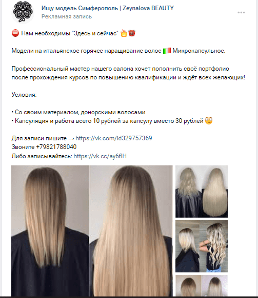Была поставлена задача набрать моделей на курсы «Наращивания волос» в самый коротки срок и очень бюджетно, так как прошлый «специалист» совершенно не справился с задачей перед курсом и необходимы было решать эту проблему «Здесь и сейчас»: